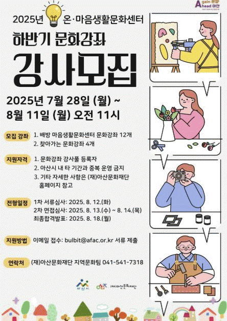°»ç ¸ðÁý ±â°£Àº 7¿ù 28ÀϺÎÅÍ 8¿ù 11ÀϱîÁö À̸ç, Áö¿øÀÚ´Â ¾Æ»ê¹®ÈÀç´Ü ȨÆäÀÌÁö °øÁö»çÇ×À» È®ÀÎÇÑ ÈÄ, À̸ÞÀÏÀ» ÅëÇØ Á¢¼öÇÒ ¼ö ÀÖ´Ù. À̹ø °»ç ¸ðÁýÀ» ÅëÇØ ÃÖ´ë 16°³ °Á°¡ ¼±Á¤µÉ ¿¹Á¤À¸·Î, Áö¿ª ÁֹεéÀÌ ´Ù¾çÇÑ ¹®È ±³À°ÀÇ ±âȸ¸¦ °¡Áú ¼ö ÀÖµµ·Ï Áö¿øÇÒ ¿¹Á¤ÀÌ´Ù.
