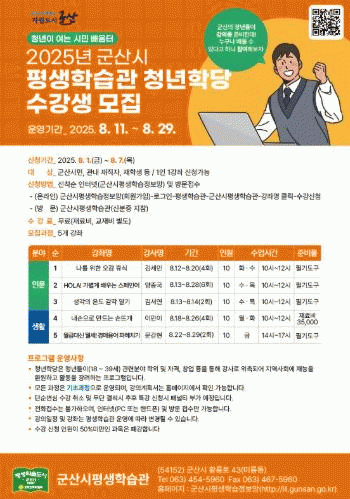 ¼ö° ½ÅûÀº 8¿ù 1ÀÏ ¿ÀÀü 9½ÃºÎÅÍ 8¿ù 7ÀÏ ¿ÀÈÄ 6½Ã±îÁö ±º»ê½ÃÆò»ýÇнÀÁ¤º¸¸Á¿¡¼ ½ÅûÇϰųª ±º»ê½ÃÆò»ýÇнÀ°üÀ¸·Î ¹æ¹® Á¢¼öÇÏ¸é µÈ´Ù.