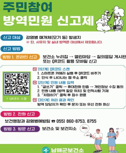 ÁֹΠ´©±¸³ª ¸ð±â ¼½ÄÁö µî ¹æ¿ªÀÌ ÇÊ¿äÇÑ Àå¼Ò¸¦ ½Å°íÇÒ ¼ö ÀÖÀ¸¸ç, Á¢¼öµÈ ¹Î¿øÀº ÇöÀå È®ÀÎ ÈÄ ¹æ¿ªÀ» ½Ç½ÃÇϰí ó¸® °á°ú´Â ½Å°íÀÚ¿¡°Ô ¾È³»µÈ´Ù.