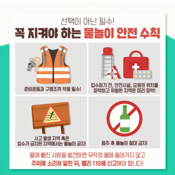 ¹°³îÀÌ ¾ÈÀü¼öÄ¢¿¡´Â ¡ã¹°³îÀÌ Àü ÃæºÐÇÑ Áغñ¿îµ¿ ¡ã±¸¸íÁ¶³¢ Âø¿ë ¡ãÀÔ¼ö Àü ¾ÈÀü½Ã¼³ ¹× ¾ÈÀü¿ä¿ø À§Ä¡ ÆÄ¾Ç ¡ã»ç°í¹ß»ý Áö¿ª ȤÀº ÀÔ¼ö°¡ ±ÝÁöµÈ Áö¿ª¿¡¼ ¹°³îÀÌ ±ÝÁö ¡ãÀ½ÁÖ ÈÄ ¹°³îÀÌ Àý´ë ±ÝÁö µîÀÌ ÀÖ´Ù.