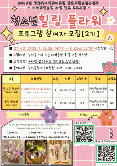 ÇÁ·Î±×·¥ ¿î¿µÀº ¿À´Â 8¿ù 9ÀÏ~23ÀÏ ¸ÅÁÖ Åä¿äÀϸ¶´Ù ÃÑ 3ȸ¿¡ °ÉÃÄ Ã»¼Ò³â¼ö·Ã°ü ¹è¿òÅÍ A±³½Ç¿¡¼ ÁøÇàµÇ¸ç, ½ÅûÀº QRÄڵ带 ÅëÇØ ¿Â¶óÀÎÀ¸·Î Á¢¼öÇϰųª °È±º½Ã¼³°ü¸®°ø´Ü ȨÆäÀÌÁö ¹× û¼Ò³â¼ö·Ã°üÀ¸·Î ¹®ÀÇÇÏ¸é µÈ´Ù.