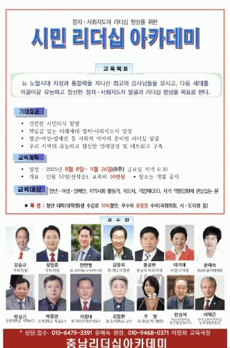 ÃæÃ»³²µµÀÇ Áö¼Ó°¡´ÉÇÑ ¹ßÀü°ú Áö¿ª»çȸÀÇ À¯´ÉÇÑ ¸®´õ½Ê ¿ª·®°È¸¦ À§ÇÑ ¡º½Ã¹Î ¸®´õ½Ê ¾ÆÄ«µ¥¹Ì¡»´Â 8¿ù 8ÀϺÎÅÍ 9¿ù 26ÀϱîÁö ¸ÅÁÖ ±Ý¿äÀÏ Àú³á 6½Ã 30ºÐºÎÅÍ 9½Ã 30ºÐ±îÁö ÃÑ 8ÁÖ°£ ¿î¿µµÇ¸ç, º» ¾ÆÄ«µ¥¹Ì´Â ´ÙÀ½ ¼¼´ë¸¦ À̲ø¾î°¥ Âü½ÅÇÑ ¹Ì·¡ÁöÇâÀû Á¤Ä¡¡¤»çȸÁöµµÀÚ ¹ß±¼ ¹× À¯´ÉÇÑ ¸®´õ½Ê Çâ»óÀ¸·Î Áö¿ª³» ÀÎÀç¾ç¼ºÀ» ¸ñÀûÀ¸·Î ÇÑ´Ù.