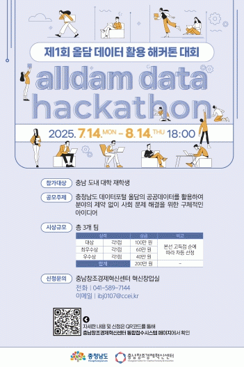 À̹ø ´ëȸ´Â ÃæÃ»³²µµ¿¡¼ ÁÖÃÖÇϰí Ãæ³²Ã¢°æ¼¾ÅͰ¡ ÁÖ°üÇϸç ÃæÃ»³²µµ µ¥ÀÌÅÍÆ÷ÅÐ ¡®¿Ã´ã¡¯ÀÇ µ¥ÀÌÅ͸¦ Ȱ¿ëÇØ »çȸ ¹®Á¦ ÇØ°áÀ» À§ÇÑ Ã¢ÀÇÀûÀÌ°í ±¸Ã¼ÀûÀÎ ¾ÆÀ̵ð¾î¸¦ ¹ß±¼ÇÏ°í ¿ì¼ö ¾ÆÀ̵ð¾î¿¡ »óÀå ¹× »ó±ÝÀ» Áö¿øÇϰíÀÚ ÇÑ´Ù.