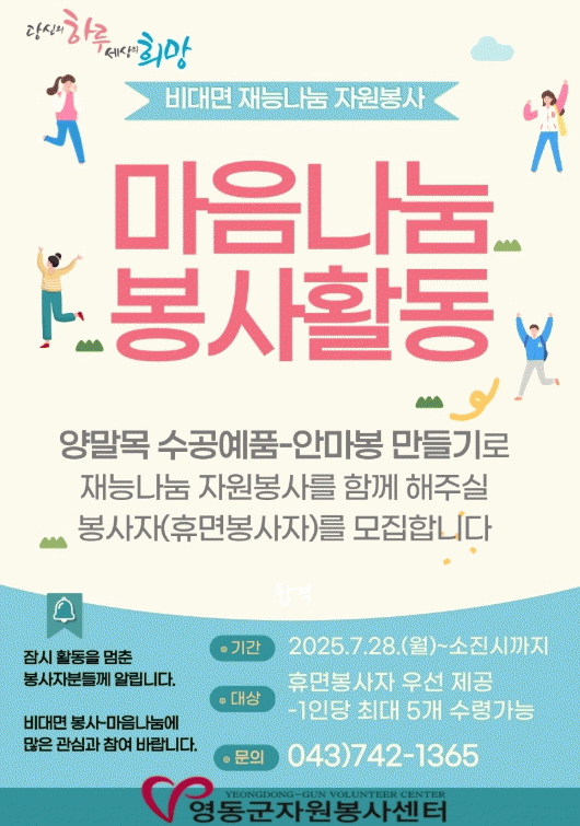 2025 ¸¶À½³ª´® »ç¾÷Àº 11¿ù±îÁö ÁøÇàµÉ ¿¹Á¤À̸ç, ÈÞ¸éºÀ»çÀÚ ¹× ½Å±Ô ºÀ»çÀÚ¸¦ ¿ì¼± ´ë»óÀ¸·Î ÁøÇàµÈ´Ù.