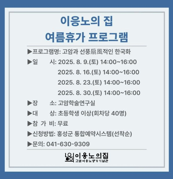 À̹ø ÇÁ·Î±×·¥Àº ¿À´Â 9ÀϺÎÅÍ 8¿ù 30ÀϱîÁö ¸ÅÁÖ Åä¿äÀÏ ¿ÀÈÄ 2½ÃºÎÅÍ 4½Ã±îÁö ÁøÇàµÇ¸ç, Âü°¡ÀÚµéÀº °í¾Ï ÀÌÀÀ³ëÀÇ ÀÛǰ ¼¼°è¸¦ °¨»óÇÑ µÚ ¸Ô°ú ºñ´°¹°, »¡´ë¸¦ Ȱ¿ëÇØ ºÎä¿¡ Çѱ¹È¸¦ ±×·Áº¸´Â ½Ã°£À» °®´Â´Ù.