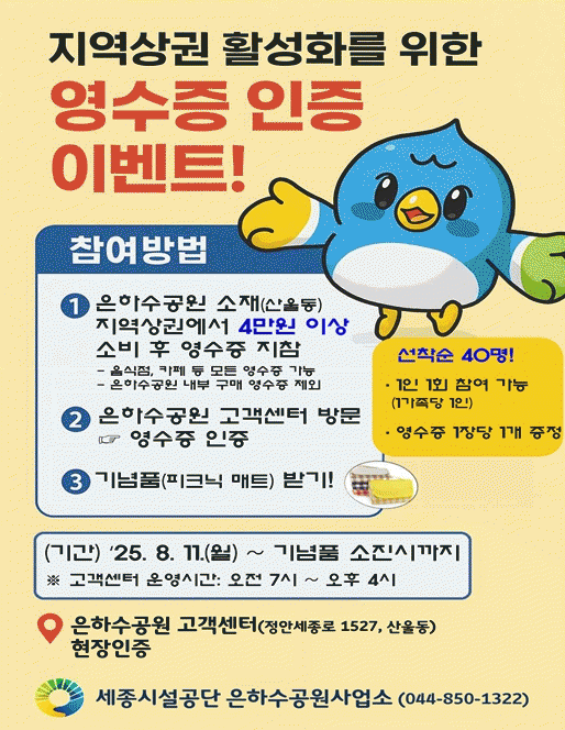 À̹ø Çà»ç´Â 8¿ù 11ÀϺÎÅÍ ±â³äǰ ¼ÒÁø ½Ã±îÁö ÁøÇàµÇ¸ç, ÀºÇϼö°ø¿ø ¼ÒÀç Áö¿ª»ó±Ç(»ê¿ïµ¿)¿¡¼ Çà»ç±â°£ µ¿¾È 4¸¸ ¿ø ÀÌ»ó °áÁ¦ÇÑ ¿µ¼öÁõÀ» ÁöÂüÇϰí ÀºÇϼö°ø¿øÀ» ¹æ¹®ÇÏ¸é ±â³äǰ(ÇÇÅ©´Ð ¸ÅÆ®)À» ¼±Âø¼ø Á¦°ø¹ÞÀ» ¼ö ÀÖ´Ù.