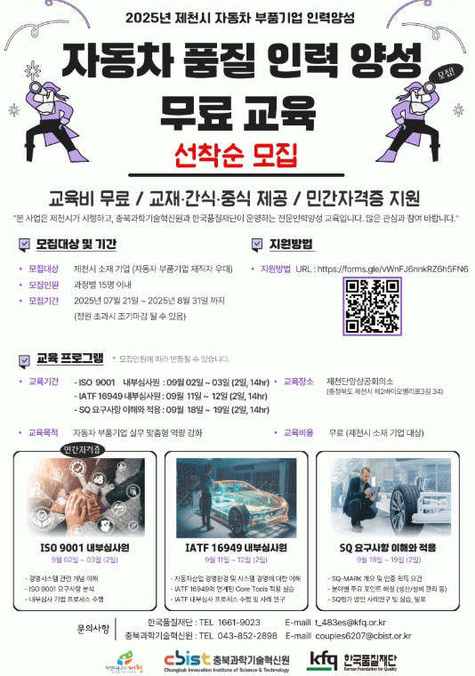 À̹ø ±³À°Àº ÀÚµ¿Â÷ ǰÁú ºÐ¾ß ½Ç¹« °æÇèÀÌ ºÎÁ·ÇÑ Áß¼Ò±â¾÷ ±Ù·ÎÀÚ¸¦ ´ë»óÀ¸·Î ÇöÀå Áß½ÉÀÇ Àü¹® Áö½ÄÀ» Á¦°øÇÏ¿©, ±â¾÷ °æÀï·Â °È¿Í Áö¿ª ³» Á¤ÂøÀ» Áö¿øÇϱâ À§ÇØ ¸¶·ÃµÆ´Ù.