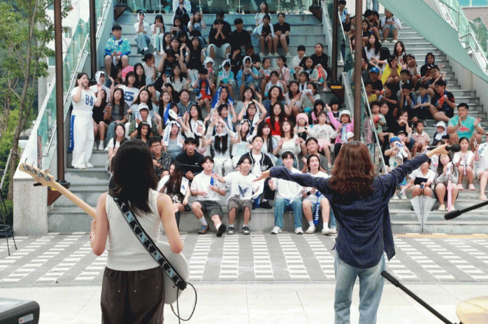 ÃàÁ¦ÀÇ ÇÏÀ̶óÀÌÆ®´Â ´Ü¿¬ û¼Ò³âµéÀÌ Á÷Á¢ ²Ù¹Î ¹«´ë¿´´Ù. ûÁÖ½Ãû¼Ò³â¼ö·Ã°ü ¼Ò¼Ó ¹êµå 2ÆÀÀÇ Æ¯º° ÃàÇϰø¿¬À» ½ÃÀÛÀ¸·Î, º¸Àº±º ³» 8°³ û¼Ò³â µ¿¾Æ¸®(¡âÆÛÁî ¡â·Ñ·¯ÄÚ½ºÅÍ¡¤ÄÃÝ ¡â½ÃÁð ¡â´ºÆäÀ̽º ¡â¹ÐŰ¿þÀÌ ¡âµ¥ÀϹêµå ¡â½ºÅ¸Æ¼½º ¡âÀ§ºê)°¡ ¶ß°Ì°í ¿Á¤ÀûÀÎ °ø¿¬À» ÆîÄ¡¸ç ÃàÁ¦ ºÐÀ§±â¸¦ ÃÖ°íÁ¶·Î ²ø¾î¿Ã·È´Ù. û¼Ò³âµéÀÇ ³ÑÄ¡´Â ³¢¿Í ¿¡³ÊÁö´Â °ü°´µéÀÇ ¶ß°Å¿î È£ÀÀÀ» ¾òÀ¸¸ç Çà»çÀåÀ» ÇÔ¼ºÀ¸·Î °¡µæ ä¿ü´Ù.