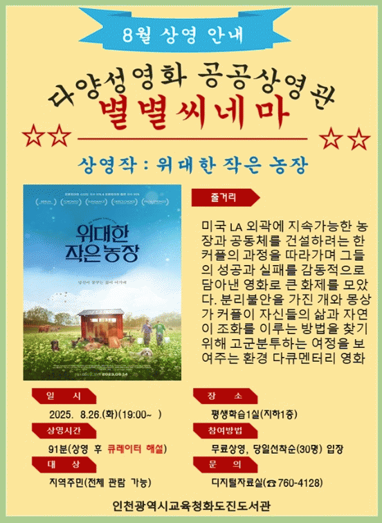 ÇÁ·Î±×·¥Àº 11¿ù±îÁö ¸Å¿ù ³Ý° ÁÖ È¿äÀÏ ¿ÀÈÄ 7½Ã, ȵµÁøµµ¼°ü Æò»ýÇнÀ 1½Ç¿¡¼ ÁøÇàµÇ¸ç, 8¿ù 26ÀÏ »ó¿µÀÛÀº Á¸ ü½ºÅÍ °¨µ¶ÀÇ ¡®À§´ëÇÑ ÀÛÀº ³óÀ塯ÀÌ´Ù.