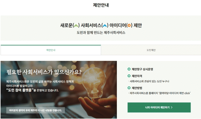 Á¦¾Èⱸ´Â Á¦ÁÖÆ¯º°ÀÚÄ¡µµ ȨÆäÀÌÁö [Âü¿©¸¶´ç-»çȸ¼ºñ½º Á¦¾È] À» ÅëÇØ ÀÌ¿ëÇÒ ¼ö ÀÖÀ¸¸ç, Á¦ÁÖµµ¹Î ´©±¸³ª ¿¬Áß »ó½Ã·Î ¾ÆÀ̵ð¾î¸¦ Á¦¾ÈÇÒ ¼ö ÀÖ´Ù.
