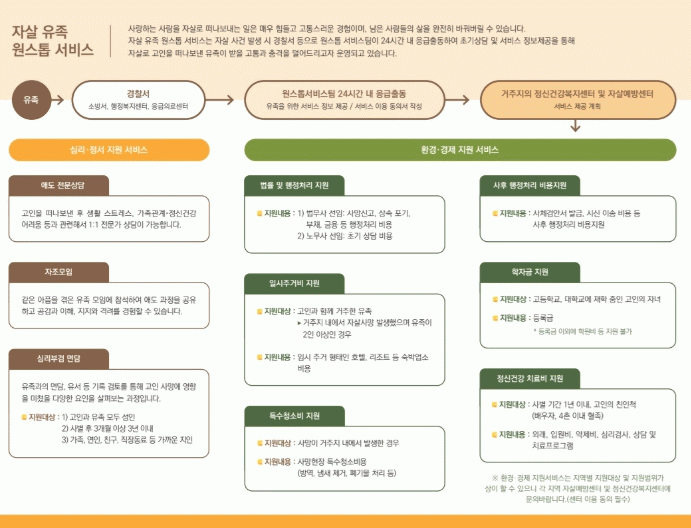 ÀÚ»ì »ç°Ç ¹ß»ý ½Ã 24½Ã°£ ³» ±ä±Þ Ãâµ¿ÇØ °íÀÎÀ» ¶°³ªº¸³½ À¯Á·¿¡°Ô ½É¸®Àû¡¤»çȸÀû¡¤ÇàÁ¤Àû Áö¿øÀ» ÅëÇÕÀûÀ¸·Î Á¦°øÇÏ´Â »ç¾÷À̸ç, Áö¿ø ´ë»óÀº °í¼º±º¿¡ Áֹεî·ÏÀ» µÎ°í ÀÖ´Â ÀÚ»ìÀ¯Á·À¸·Î, °í¼º±ºÁ¤½Å°Ç°º¹Áö¼¾ÅÍ »ç·Ê°ü¸® µî·Ï¿¡ µ¿ÀÇ ÇÑ °æ¿ì ¼ºñ½º¸¦ ¹ÞÀ» ¼ö ÀÖ´Ù.