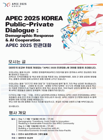 À̹ø ¹Î°ü´ëÈ´Â ¿À´Â 10¿ù APEC Á¤»óȸÀÇ ÇÙ½É ¼º°ú·Î ÃßÁø ÁßÀΡ®Àα¸±¸Á¶ º¯È ´ëÀÀ¡¯°ú ¡®ÀΰøÁö´É(AI) Çù·Â¡¯À» ÁÖÁ¦·Î 2Àϰ£ ÁøÇàµÈ´Ù.