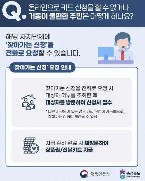 ¡®Ã£¾Æ°¡´Â ½Åû¡¯ ´ë»óÀº Á¦Ãµ½Ã¿¡ Áֹεî·ÏÀ» µÐ °í·ÉÀÚ, Àå¾ÖÀÎ, º´¿ø ¶Ç´Â ½Ã¼³ ÀÔ¼ÒÀÚ µîÀ¸·Î, ÁÖ¼ÒÁö °üÇÒ À¾¸éµ¿ ÇàÁ¤º¹Áö¼¾ÅÍ ¶Ç´Â Àü¿ë Äݼ¾Å͸¦ ÅëÇØ ½ÅûÀ» ¹Þ´Â´Ù. ½ÅûÀÌ Á¢¼öµÇ¸é Àü´ã °ø¹«¿øÀÌ Á÷Á¢ °ÅÁÖÁö¸¦ ¹æ¹®ÇØ ½Åû¼¸¦ ÀÛ¼ºÇϰí, º»ÀÎ È®ÀÎÀ» °ÅÃÄ Áö·ùÇü ¼ÒºñÄíÆùÀ» Áö±ÞÇÑ´Ù.