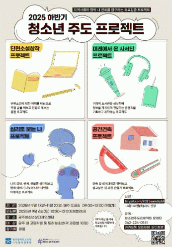 ÇÁ·Î±×·¥Àº 9¿ù 13ÀϺÎÅÍ 11¿ù 22±îÁö ¸ÅÁÖ Åä¿äÀÏ ¿ÀÀü 9½ÃºÎÅÍ 4½Ã°£µ¿¾È ±¤ÁÖû¼Ò³â»îµðÀÚÀμ¾ÅÍ¿¡¼ ¡ã´ÜÆí¼Ò¼³ âÀÛ ¡ã°ø°£ °ÇÃà ¡ã½É¸®·Î º¸´Â ¡®³ª¡¯ ¡ã¹Ì·¡¿¡¼ ¿Â »ç¼µé µî 4°³ °úÁ¤À¸·Î ÁøÇàµÈ´Ù.