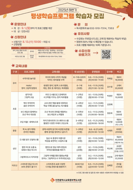 À̹ø ÇÁ·Î±×·¥Àº ¡ã À¯¾Æ(6~7¼¼) ´ë»ó¡®¼öÇÐÀ̶û ³îÀ̶û,¡®Hello! ¿µ¾î ±×¸²Ã¥ ŽÇè´ë¡¯¡ã ÃÊµî ´ë»ó¡®(ÃÊ1~2Çгâ) »ý°¢ÀÌµç ±×¸²Ã¥ ±³½Ç¡¯,¡®(ÃÊ3~4Çгâ)Ã¥ÀÌ ¶Ñ¹÷¶Ñ¹÷ ±ÛÀÌ ¶Ç¹Ú¶Ç¹Ú¡¯,¡®(ÃÊ3~5Çгâ) º¸µå°ÔÀÓ°ú ÇÔ²²ÇÏ´Â Á¶¼± ¿ª»ç ´ë¸ðÇ衯,¡®(ÃÊ3~6Çгâ)ÄÚµù ¸¶ºí! ¼¼°è¼ÓÀ¸·Î¡¯¡ã Áßµî ´ë»ó¡®Ã¥ ¼Ó »ý°¢ ÅåÅå! ¿Â¶óÀÎ ºÏŬ·´¡¯¡ã¼ºÀÎ ´ë»ó¡®µµ½Ã¸¦ ´ãÀº ¿ÀÀÏÆÄ½ºÅÚ¡¯,¡®Ä¸ÄÆ PC·Î ¼ôÆû¡¤À¯Æ©ºê ¿µ»ó ¸¶½ºÅÍ¡¯,¡®±×¸²Ã¥Áöµµ»ç ÀڰݰúÁ¤¡¯¡ã ¾î¸£½Å ´ë»ó¡®½º¸¶Æ®Æù Áß±Þ ¸¶½ºÅÍ_ÀΰøÁö´É(AI)°ú ÄÜÅÙÃ÷ Áñ±â±â¡¯µî 11°³ °Á¸¦ ¿î¿µÇÑ´Ù.