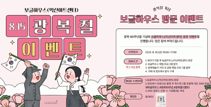 ÀÍ»ê½Ã´Â Àͻ깮Ȱü±¤Àç´Ü(´ëÇ¥ÀÌ»ç ±è¼¼¸¸)ÀÌ ¿À´Â 15ÀÏ º¸±ÛÇϿ콺(ÀÍ»ê¾ÆÆ®¼¾ÅÍ)¿Í ¹®È¿¹¼úÀÇ °Å¸® ÀÏ¿ø¿¡¼ '±¤º¹ 80Áֳ⠱â³äÇà»ç'¸¦ °³ÃÖÇÑ´Ù°í 12ÀÏ ¹àÇû´Ù.