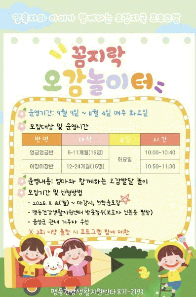 ¼¾ÅÍ´Â Àü¹® °»ç¸¦ ÃʺùÇØ ¿µÀ¯¾Æ¡¤¾Æµ¿ ÇÁ·Î±×·¥ÀÎ ¡®²ÄÁö¶ô ¿À°¨³îÀÌÅÍ¡¯¿Í ¡®¾¦¾¦¡¤Æ°Æ° üÁ¶±³½Ç¡¯À» ¿À´Â 9¿ùºÎÅÍ 11¿ù±îÁö ÁÖ 1ȸ ÃÑ 8ȸ·Î ¸Íµ¿°Ç°»ýȰÁö¿ø¼¾ÅÍ¿¡¼ ÁøÇàÇÑ´Ù.