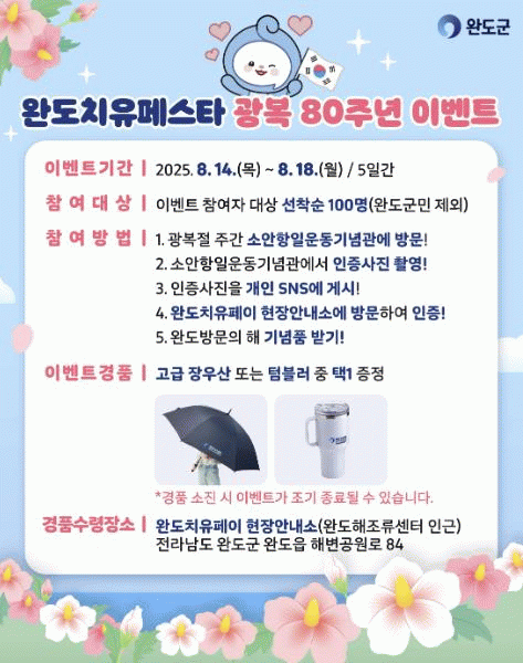 À̺¥Æ®´Â ¼Ò¾ÈµµÀÇ ¼Ò¾ÈÇ×ÀϿ±â³ä°üÀ» ¹æ¹®ÇÑ °ü±¤°´ 100¸íÀ» ´ë»óÀ¸·Î 8¿ù 14ÀϺÎÅÍ 18ÀϱîÁö ÁøÇàÇϸç, ¡®2025 ¿Ïµµ ¹æ¹®ÀÇ ÇØ¡¯ ±â³äǰ(Àå ¿ì»ê, ÅÒºí·¯ Áß Åà 1)À» ÁõÁ¤ÇÒ °èȹÀÌ´Ù.