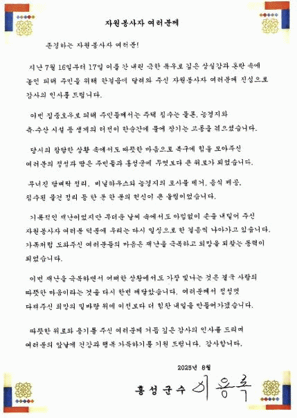 ÀÌ ±º¼ö´Â ¼ÇÑÀ» ÅëÇØ "Æø¿ì·Î ÇÇÇØ¸¦ ÀÔÀº ¿ì¸® ±º¿¡ µû¶æÇÑ ¼Õ±æÀ» º¸³»ÁֽŠ¿©·¯ºÐÀÇ Èñ»ý°ú Çå½Å ´öºÐ¿¡ ÁֹεéÀÌ ´Ù½Ã ÀϾ ¿ë±â¸¦ ¾ò°í ÀÖ´Ù¡±¸ç ÀÚ¿øºÀ»ç ÇÑ ºÐ ÇÑ ºÐÀÇ ¼ö°í¿Í ¿Á¤ÀÌ ¿ì¸® Áö¿ª »çȸ¸¦ ´õ µû¶æÇÏ°Ô ¸¸µé¾ú´Ù¸ç Áø½ÉÀ¸·Î °¨»çÇÏ´Ù°í ¹àÇû´Ù.