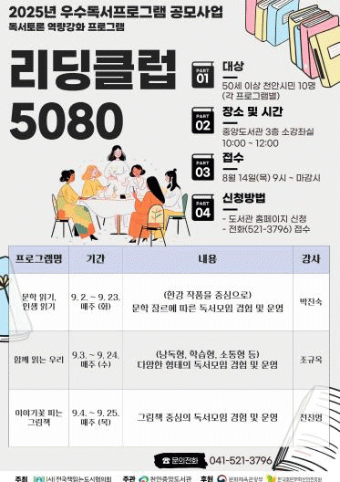 À̹ø ÇÁ·Î±×·¥Àº ¡ã¹®ÇÐ Àбâ, Àλý Àб⠡ãÇÔ²² Àд ¿ì¸® ¡ãÀ̾߱â²É ÇÇ´Â ±×¸²Ã¥À¸·Î ±¸¼ºµÆÀ¸¸ç, °¢ ¸ðÀÓº°·Î µ¶¼Åä·Ð, °¨»ó ³ª´©±â, ÀÛ°¡¿ÍÀÇ ¸¸³² µîÀÌ ÁøÇàµÉ ¿¹Á¤ÀÌ´Ù.