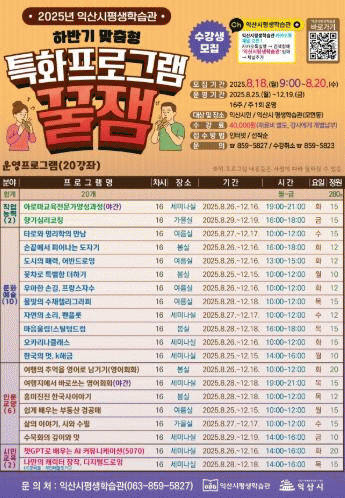 À̹ø ÇÁ·Î±×·¥Àº 8¿ù 25ÀϺÎÅÍ 12¿ù 19ÀϱîÁö 16ÁÖ°£ ¿î¿µµÇ¸ç ¡âÁ÷¾÷´É·Â ¡â¹®È¿¹¼ú ¡âÀι®±³¾ç ¡â½Ã¹Î±³À° µî 4°³ ºÐ¾ß, 20°³ °Á·Π±¸¼ºµÆ´Ù.