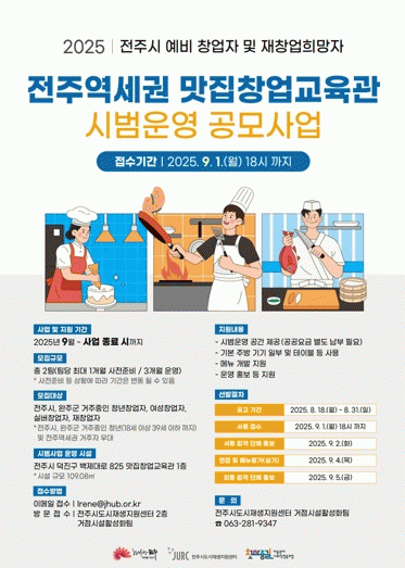 ÀÌ »ç¾÷Àº ¿Ü½Ä â¾÷À» Èñ¸ÁÇÏ´Â Áö¿ª¹ÎÀ» ´ë»óÀ¸·Î â¾÷ ¿î¿µ ±âȸ¿Í ¸ÂÃãÇü Áö¿ø ÇÁ·Î±×·¥ µîÀ» Á¦°øÇÏ´Â °ÍÀ¸·Î, ÀüÁֽ᤿ÏÁÖ±º¿¡ °ÅÁÖÁßÀΠû³ââ¾÷ÀÚ, ¿©¼ºÃ¢¾÷ÀÚ, ½Ç¹öâ¾÷ÀÚ, Àçâ¾÷ÀÚ¸¦ ´ë»óÀ¸·Î ¡â½Ã¹ü¿î¿µ °ø°£ Á¦°ø ¡â±âº» ÁÖ¹æ ±â±â ÀϺΠ¹× Å×ÀÌºí µî »ç¿ë ¡â¸Þ´º °³¹ß ¡â¿î¿µ È«º¸ µîÀ» Áö¿øÇÑ´Ù.