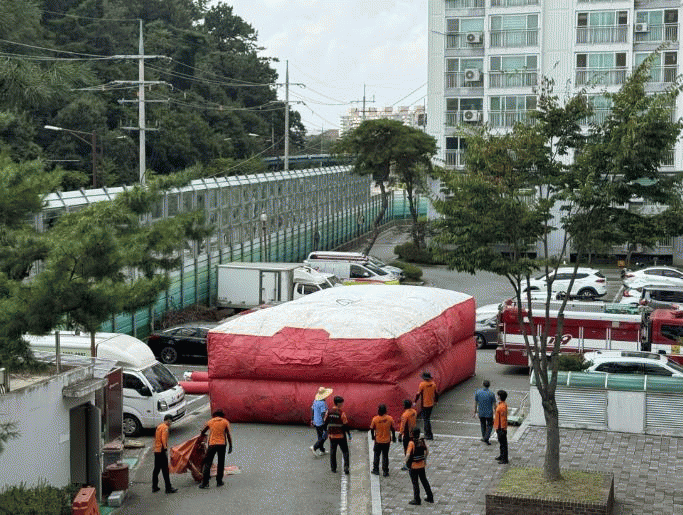 ÈÆ·Ã ³»¿ëÀº ¡â°ø±â¾ÈÀü¸ÅÆ® Àü°³ ¹× ±â´É Á¡°Ë ¡âÀÎ¸í±¸Á¶ ´ëÀÀ¹æ¾È ÅäÀÇ ¡âÀÛµ¿¿ø¸®¿Í ÁÖÀÇ»çÇ× ¼÷Áö ¡â°øµ¿ÁÖÅà °ü°èÀÚ ´ë»ó °ü¸® ¿ä·É ±³À° µîÀ¸·Î ÁøÇàµÆ´Ù. À̹ø ¾ÆÆÄÆ® ÈÆ·Ã¿¡ »ç¿ëµÈ °ø±â¾ÈÀü¸ÅÆ®´Â ÃÖ´ë 10Ãþ ³ôÀÌ¿¡¼µµ ºñ»óÅ»ÃâÀÌ °¡´ÉÇϸç Àü°³½Ã°£Àº ¾à 2ºÐ°¡·® ¼Ò¿äµÆ´Ù.