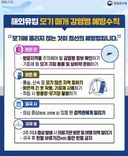 ÇØ¿Ü¿©ÇàÀ» °èȹÇÏ´Â °æ¿ì Ãâ±¹ Àü Áúº´°ü¸®Ã» ´©¸®Áý¿¡¼ ¿©Çà ±¹°¡ÀÇ °¨¿°º´ ¹ß»ý ÇöȲ°ú ÁÖÀÇ »çÇ×À» È®ÀÎÇØ¾ß ÇÏ¸ç ¿©Çà Áß¿¡´Â ¹àÀº»ö ±ä ¿ÊÀ» Âø¿ëÇÏ°í ¸ð±â ±âÇÇÁ¦¸¦ 3~4½Ã°£ °£°ÝÀ¸·Î »ç¿ëÇÏ´Â °ÍÀÌ ÁÁ´Ù.