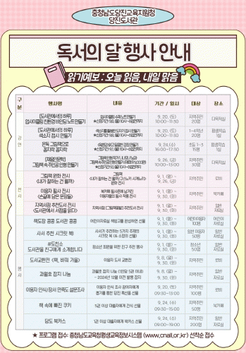 À̹ø µ¶¼ÀÇ ´ÞÀº ¡°Àб⿹º¸ : ¿À´Ã ÀÐÀ½, ³»ÀÏ ¸¼À½¡±À̶ó´Â ÁÖÁ¦·Î ÁøÇàµÇ¸ç, µµ¼°ü¿¡¼´Â µ¶¼ÀÇ °¡Ä¡¿Í Çʿ伺À» ¾Ë¸®°í Áö¿ªÁֹεéÀÇ µµ¼°ü ÀÌ¿ë Ȱ¼ºÈ¸¦ À§ÇØ ´Ù¾çÇÑ ÇÁ·Î±×·¥µéÀ» ¼±º¸ÀÏ ¿¹Á¤ÀÌ´Ù.