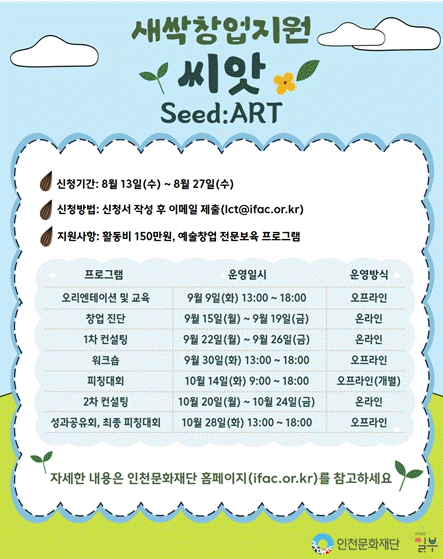 ¡®»õ½Ïâ¾÷Áö¿ø ¾¾¾Ñ(Seed:ART)¡¯Àº ¿¹¼ú ±â¹Ý À¯¸Á ¾ÆÀ̵ð¾îÀÇ ½ÃÀ强À» °ÈÇÏ°í »ç¾÷È ¿ª·®À» Çâ»óÇϰíÀÚ ÇÏ´Â ¿¹ºñâ¾÷ÀÚ¸¦ Áö¿øÇÑ´Ù. À̸¦ À§ÇØ ÀÎõ¹®ÈÀç´ÜÀº Àü¹® ¾×¼¿·¯·¹ÀÌÅÍ ¢ßÇÇÁöº¥Ã³½º¿Í Çù·ÂÇÏ¿© û³â ¿¹¼ú â¾÷ÀÚ À°¼ºÀ» À§ÇÑ ¸ÂÃãÇü â¾÷ Áö¿ø ÇÁ·Î±×·¥À» ¿î¿µÇÑ´Ù. ¶ÇÇÑ ¹®È¿¹¼ú â¾÷ ¾ÆÀÌÅÛ ¹ß±¼À» À§ÇÑ È°µ¿ºñ 150¸¸¿øÀ» Áö¿øÇϸç, ¿ì¼ö â¾÷¸ðµ¨ ¼³°èÀÚ¿¡°Ô´Â ½Ã»ó±Ýµµ Áö±ÞÇÑ´Ù.