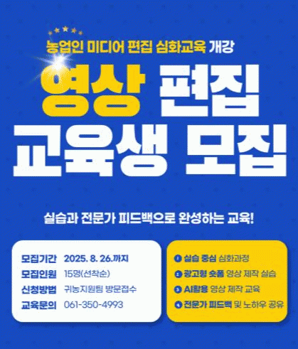 ¿µ±¤±º³ó¾÷±â¼ú¼¾ÅÍ °ü°èÀÚ´Â ¡°À̹ø ½Éȱ³À°À» ÅëÇØ ³ó¾÷ÀεéÀÌ ÇÑÃþ ´õ Àü¹®ÀûÀÎ ¿µ»ó Á¦ÀÛ ´É·ÂÀ» °®Ãß¾î ³ó»ê¹° È«º¸ È¿°ú¸¦ ±Ø´ëÈÇÒ ¼ö ÀÖÀ» °ÍÀ¸·Î ±â´ëÇÑ´Ù¡±¶ó¸ç, ¡°¾ÕÀ¸·Îµµ ³ó¾÷ÀÎÀÇ ¹Ìµð¾î ¿ª·® °È¸¦ À§ÇÑ Áö¼ÓÀûÀÎ ±³À°°ú Áö¿øÀ» À̾ °Í¡±À̶ó°í ¸»Çß´Ù.