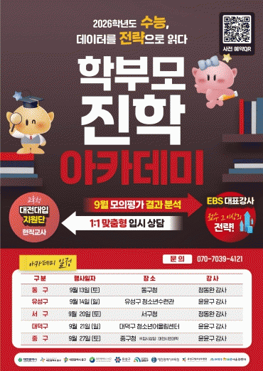 ¿ÀÀü(09:20~12:30)¿¡´Â ´ëÀü½Ã±³À°Ã» ´ëÀü´ëÀÔÁö¿ø´Ü ¼Ò¼Ó ÇöÁ÷ ±³»ç°¡ ¼öÇè»ý °³ÀÎ ¼ºÀû µ¥ÀÌÅ͸¦ ºÐ¼®ÇØ 1:1·Î Áö¿ø °¡´É ´ëÇаú ÇнÀ Àü·«À» »ó´ãÇÑ´Ù. ÀÚÄ¡±¸º° 25ÆÀ(ÆÀ´ç 30ºÐ)À» ¼±Âø¼ø ¸ðÁýÇϸç, Á¢¼ö´Â 8¿ù 25ÀÏ ¿ÀÈÄ 2½ÃºÎÅÍ QRÄÚµå ¶Ç´Â »çÀü ¿¹¾à ȨÆäÀÌÁö¸¦ ÅëÇØ °¡´ÉÇÏ´Ù.