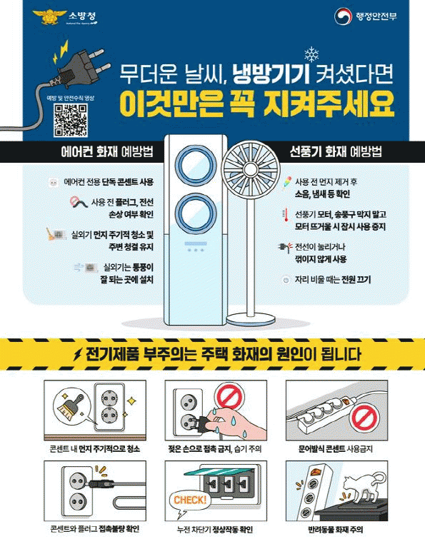 ¼Ò¹æ¼¿¡ µû¸£¸é ÃÖ±Ù ¹«´õ¿î ³¯¾¾·Î ³Ã¹æ±â±â »ç¿ë·®ÀÌ Áõ°¡ÇÏ¸é¼ ¹®¾î¹ß½Ä Äܼ¾Æ® »ç¿ë, Àü±âÁ¦Ç° °ú¿ µîÀ¸·Î ÀÎÇÑ ÈÀç°¡ ºó¹øÇÏ°Ô ¹ß»ýÇϰí ÀÖ´Ù. ÀÌ¿¡ µû¶ó °¡Á¤¿¡¼ ¹Ýµå½Ã ÁöÄÑ¾ß ÇÒ ¾ÈÀü ¼öÄ¢À¸·Î ¡ã¿¡¾îÄÁÀº Àü¿ë ´Üµ¶ Äܼ¾Æ® »ç¿ë ¡ã»ç¿ë Àü Ç÷¯±×¡¤Àü¼± ¼Õ»ó ¿©ºÎ È®ÀÎ ¡ã½Ç¿Ü±â´Â ÅëdzÀÌ ÀߵǴ °÷¿¡ ¼³Ä¡ ¡ã¼±Ç³±â´Â »ç¿ë Àü ¸ÕÁö Á¦°Å ÈÄ ¼ÒÀ½¡¤³¿»õ Á¡°Ë ¡ãÀÚ¸® ºñ¿ò ½Ã Àü¿ø Â÷´Ü µîÀÌ °Á¶µÆ´Ù.