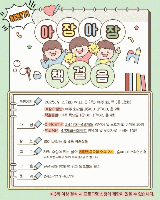 ¿¬·É´ë¿¡ µû¶ó ¹ÝÀ» ³ª´©¾î ¿î¿µÇϸ确¾ÆÀ徯Àå¹Ý¡¯(24°³¿ùºÎÅÍ 48°³¿ù ¿µ¾Æ¿Í º¸È£ÀÚ)Àº ¸ÅÁÖ È¿äÀÏ ¿ÀÈÄ 4½Ã,¡®Ã¥°ÉÀ½¹Ý¡¯(49°³¿ùºÎÅÍ ¹ÌÃëÇÐ À¯¾Æ¿Í º¸È£ÀÚ)Àº ¸ÅÁÖ ¸ñ¿äÀÏ ¿ÀÈÄ 4½Ã¿¡ °¢°¢ 1½Ã°£¾¿ ¿î¿µµÈ´Ù.