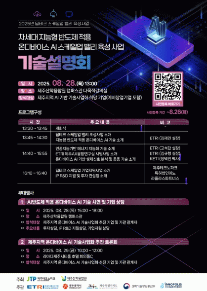 Â÷¼¼´ë Áö´ÉÇü ¹ÝµµÃ¼ Àû¿ë ¿Âµð¹ÙÀ̽º AI ½ºÄÉÀϾ÷¹ë¸® À°¼º»ç¾÷Àº °úÇбâ¼úÁ¤º¸Åë½ÅºÎ¿Í Á¦ÁÖÆ¯º°ÀÚÄ¡µµ, ¿¬±¸°³¹ßƯ±¸ÁøÈïÀç´ÜÀÇ Áö¿øÀ¸·Î ETRI¿¡¼ ÁÖ°üÇϰí, Á¦ÁÖTP¿Í Á¦ÁÖ»êÇÐÀ¶ÇÕ¿øÀº Á¦ÁÖ±â¾÷ À°¼º ¾÷¹«¸¦ ¸Ã¾Æ ÃßÁøµÇ°í ÀÖ´Ù.