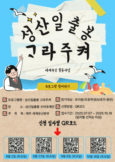 ÀÌ ÇÁ·Î±×·¥Àº ¼º»êÀÏÃâºÀ ¼ö¸¶Æ÷ ÇØ¾È¿¡¼ ÃÑ 4ȸ(8/2, 8/23, 9/6, 10/18)¿¡ °ÉÃÄ »çÀü¿¹¾àÁ¦·Î ¿î¿µµÇ¸ç, ¸Åȸ 20¸íÀÇ °¡Á· ´ÜÀ§ Âü°¡ÀÚ¸¦ ´ë»óÀ¸·Î 10¿ù±îÁö ÁøÇàµÈ´Ù.