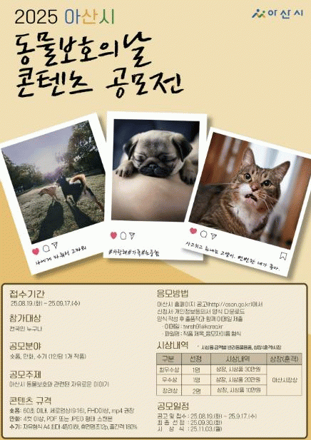 °ø¸ð´Â 8¿ù 19ÀϺÎÅÍ 9¿ù 17ÀϱîÁö ±¹¹Î ´©±¸³ª Âü¿©ÇÒ ¼ö ÀÖÀ¸¸ç, ÁÖÁ¦´Â ¾Æ»ê½Ã µ¿¹°º¸È£¿Í °ü·ÃµÈ ÀÚÀ¯·Î¿î À̾߱â´Ù. ¼ôÆû, ¸¸È, ¼ö±â µî 3°³ ºÐ¾ß·Î ÀÛǰÀ» Á¢¼ö¹ÞÀ¸¸ç, ¼ö»óÀÛÀº 9¿ù 30ÀÏ ½Ã ȨÆäÀÌÁö¸¦ ÅëÇØ ¹ßÇ¥µÈ´Ù.