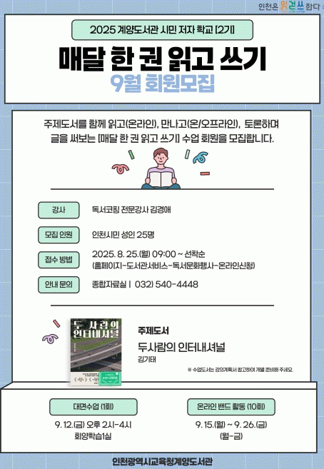 À̹ø 9¿ùÀÇ ÁÖÁ¦ µµ¼´Â ¡®µÎ »ç¶÷ÀÇ ÀÎÅͳ»¼Å³Î¡¯·Î Âü°¡ÀÚµéÀº ÇÔ²² Ã¥À» ÀÐ°í »ý°¢À» ³ª´©¸ç ±Û¾²±âÀÇ Áñ°Å¿òÀ» ´À³¢°í ÀÚ½ÅÀ» Ç¥ÇöÇϸç ŸÀΰú °ø°¨ÇÏ´Â ½Ã°£À» °®´Â´Ù.