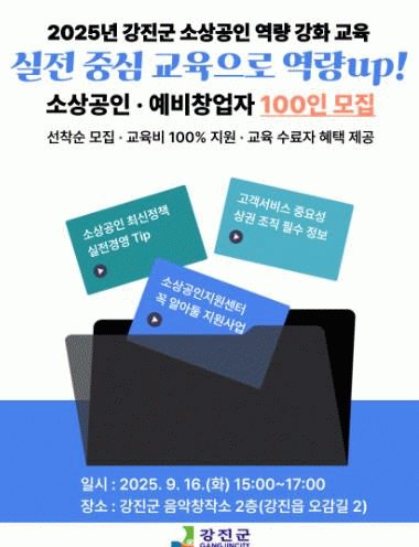 À̹ø ±³À°Àº 9¿ù 16ÀÏ ¿ÀÈÄ 3½ÃºÎÅÍ 5½Ã±îÁö, °Áø±º À½¾ÇâÀÛ¼Ò¿¡¼ ÁøÇàµÉ ¿¹Á¤À¸·Î °³ÀÎ(¼Ò»ó°øÀÎ ¹× ¿¹ºñâ¾÷ÀÚ)°ú ´Üü(»óÀÎȸ ¹× ¿¹ºñ»óÀÎȸ)·Î ³ª´² ½Åû¹ÞÀ¸¸ç ÃÑ 100¸íÀ» ¼±Âø¼øÀ¸·Î ¸ðÁýÇÑ´Ù.