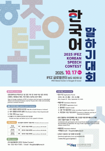 ÀÎõ°æÁ¦ÀÚÀ¯±¸¿ªÃ»Àº ¿À´Â 10¿ù 17ÀÏ IFEZ ±Û·Î¹ú¼¾ÅÍ¿¡¼ ¡®2025³â IFEZ Çѱ¹¾î ¸»Çϱ⠴ëȸ¡¯¸¦ °³ÃÖÇÑ´Ù°í ¹àÇû´Ù.
