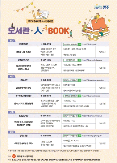 À̹ø Çà»ç´Â Áö¿ª ´ëÇ¥ µµ¼°üÀÎ ½Ã¸³µµ¼°üÀÌ ÁÖÃÖÇÏ°í ¡ãÃ¥Á¤¿øµµ¼°ü ¡ã±¤ÁÖÁß¾Óµµ¼°ü ¡ã»ó·Ïµµ¼°ü ¡ãÇлý±³À°¹®Èȸ°ü ¡ãû¼Ò³âµµ¼°ü ¡ãÀϰ¼°üÀÌ ÇÔ²² ÇÑ´Ù. Çà»ç ±â°£ ÀÛ°¡¿ÍÀÇ ¸¸³², ¸¶¼ú °ø¿¬, Àι®ÇÐ °¿¬ µî Ã¥°ú °¡±î¿öÁú ¼ö ÀÖ´Â ´Ù¾çÇÑ ÇÁ·Î±×·¥ÀÌ ¸¶·ÃµÈ´Ù.