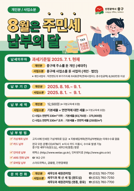 ¸ÕÀú Áֹμ¼ °³ÀκÐÀÇ °æ¿ì °ú¼¼±âÁØÀÏ(7¿ù 1ÀÏ) ÇöÀç ÀÎõ Áß±¸¿¡ ÁÖ¼Ò¸¦ µÐ ¼¼´ëÁÖ¿¡ 12,500¿ø(Áö¹æ±³À°¼¼ Æ÷ÇÔ)ÀÌ °ú¼¼µÈ´Ù.