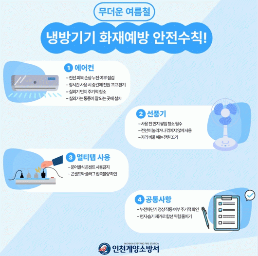 ¼Ò¹æ¼¿¡ µû¸£¸é ¹«´õÀ§ ¼Ó Àå½Ã°£ ³Ã¹æ±â±â »ç¿ëÀÌ À̾îÁö¸é¼ Àü±â ÇÕ¼±À̳ª °úºÎÇÏ·Î ÀÎÇÑ ÈÀç ¹ß»ý À§ÇèÀÌ ³ô¾ÆÁö°í ÀÖ´Ù. ÀÌ¿¡ µû¶ó ³Ã¹æ±â±â »ç¿ë Àü¡¤ÈÄ Á¡°Ë°ú ¾ÈÀüÇÑ »ç¿ëÀÌ ¹«¾ùº¸´Ù Áß¿äÇÏ´Ù.