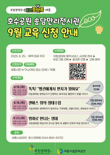 ¼¼Á¾Æ¯º°ÀÚÄ¡½Ã½Ã¼³°ü¸®°ø´ÜÀº ±¹¸³»ýÅ¿ø°ú ÇÔ²² ¸¶·ÃÇÑ ¡®¸íÈ·Î ¸¸³ª´Â »ýÅ¡¯ Ưº°Àü½Ã¿Í ¿¬°èÇØ 9¿ùºÎÅÍ ½Ã¹Î ´ë»ó »ýű³À° ÇÁ·Î±×·¥À» ¿î¿µÇÑ´Ù°í ¹àÇû´Ù.
