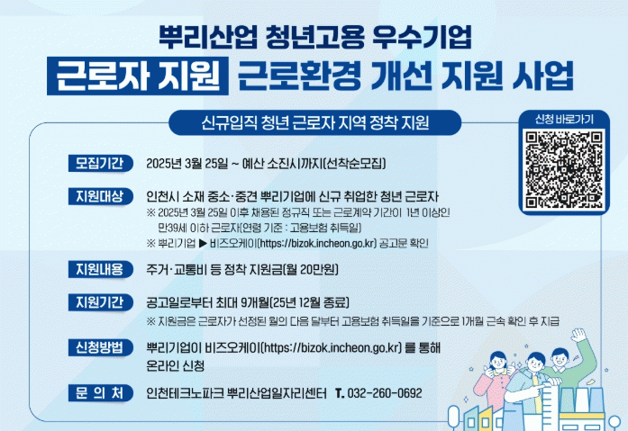 Áö¿ø ´ë»óÀº »ó½Ã±Ù·ÎÀÚ 5ÀÎ ÀÌ»ó, ¸ÅÃâ¾× 5¾ï ¿ø ÀÌ»óÀÎ ÀÎõ »Ñ¸®±â¾÷¿¡¼ 1³â ÀÌ»óÀÇ ±Ù·Î°è¾àÀ» ¸ÎÀº ¸¸ 39¼¼ ÀÌÇÏ Ã»³â ±Ù·ÎÀÚ·Î, °ü·Ã ¹ý·üÀ̳ª ÀÎõTP ºÐ·ùÄڵ忡 µû¸¥ ¡®»Ñ¸®±â¾÷¡¯ÀÌ ½ÅûÇÒ ¼ö ÀÖ´Ù.