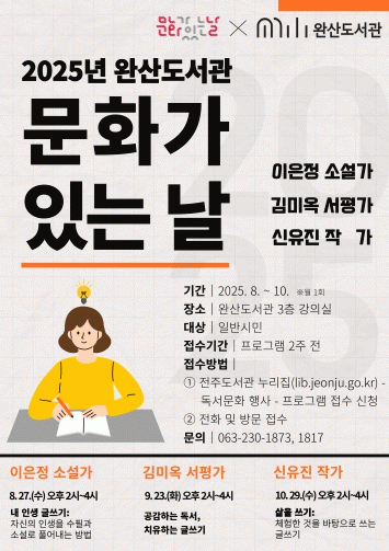 À̹ø °¿¬Àº ¿Ï»êµµ¼°üÀÌ ¸Å¿ù ¸¶Áö¸·ÁÖ ¡®¹®È°¡ ÀÖ´Â ³¯¡¯À» ¸Â¾Æ ¼Ò¼³°¡¿Í ¼Æò°¡, ÀÛ°¡¸¦ ÃÊÃ»ÇØ ½Ã¹ÎµéÀÌ »îÀ» µ¹¾Æº¸°í ±Û¾²±â¸¦ ÅëÇØ ÀÚ½ÅÀ» Ç¥ÇöÇÒ ¼ö ÀÖµµ·Ï µ½±â À§ÇØ ±âȹµÆ´Ù.