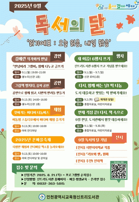 ¶ÇÇÑ ¡ã±è¾Ö¶õ ÀÛ°¡¿ÍÀÇ ¸¸³²(9¿ù 1ÀÏ) ¡ã±×¸²Ã¥°ú À½¾ÇÀ» °áÇÕÇÑ ¿¹¼ú °ø¿¬ '±×¸²Ã¥ ÆîÄ¡´Ù, À½¾Ç °ø¿¬'(9¿ù 13ÀÏ) ¡ã¹æ¼Û Á¦ÀÛ Àåºñ¸¦ üÇèÇÒ ¼ö ÀÖ´Â 'ã¾Æ°¡´Â ¹Ìµð¾î ³ª´®¹ö½º'(9¿ù 13ÀÏ) ¡ã'¿¬Ã¼ °ÆÁ¤ ³¡! ´Ù½Ã, Ã¥ ¼ÓÀ¸·Î'(9¿ù 1ÀÏ~30ÀÏ) µî ´Ù¾çÇÑ µ¶¼¹®È ÇÁ·Î±×·¥µµ ÁøÇàµÈ´Ù.