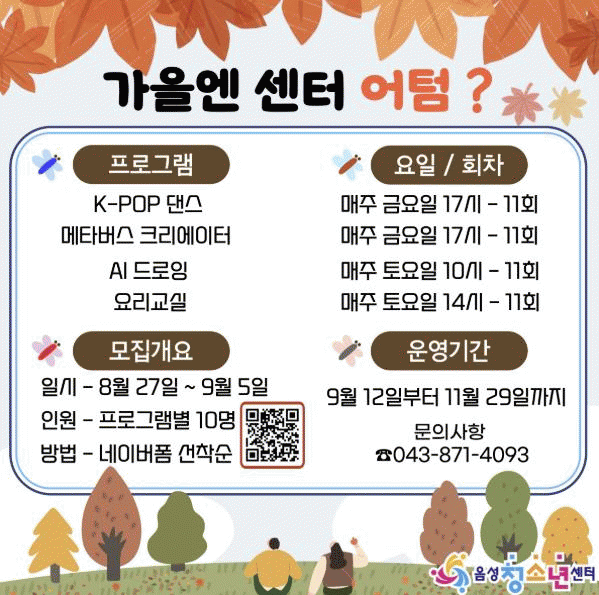 ¸ðÁý ´ë»óÀº À½¼º±º ³» û¼Ò³âÀ¸·Î, ÀÌ´Þ 27ÀϺÎÅÍ 9¿ù 5ÀϱîÁö ³×À̹ö ÆûÀ» ÅëÇØ 1ÀÎ 1°Á¸¦ ¼±Âø¼ø Á¢¼öÇÑ´Ù. °¢ ÇÁ·Î±×·¥ÀÇ ¸ðÁý ÀοøÀº 10¸íÀ¸·Î Á¦ÇѵǸç, ¸ðÁý ÀοøÀÌ ¹Ì´ÞÇÑ ¶§¿¡´Â Áߺ¹ ½Åûµµ °¡´ÉÇÏ´Ù.