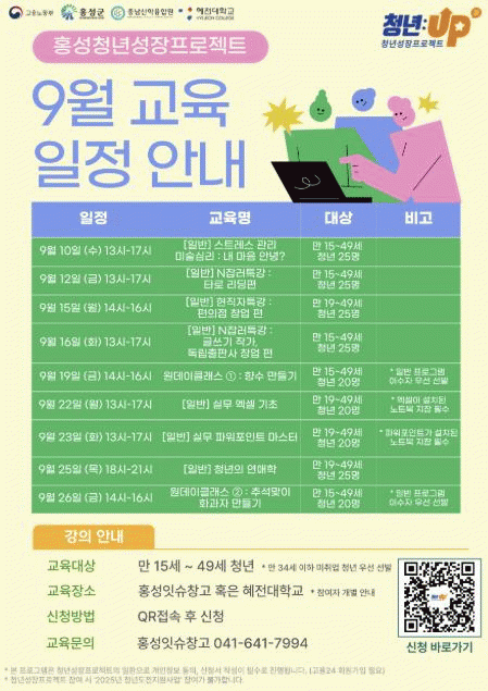 ¸ðµç ÇÁ·Î±×·¥Àº QRÄڵ带 ÅëÇØ »çÀü ½ÅÃ»ÇØ¾ß Çϸç, Âü¿©ÀÚ´Â °í¿ë24 ȸ¿ø°¡ÀÔ ÈÄ ½Åû °¡´ÉÇϸç, ±³À°º° Âü¿©ÀÚ¿¡°Ô´Â °³º° ¾È³»°¡ Á¦°øµÈ´Ù. ÀϺΠ°Á´ ³ëÆ®ºÏ ÁöÂüÀÌ ÇʼöÀÌ´Ù. ±³À° °ü·Ã ¹®ÀÇ´Â È«¼ºÀÕ½´Ã¢°í·Î ÇÏ¸é µÈ´Ù.