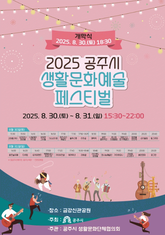 °øÁֽùΰú »ýȰ¹®È¿¹¼úÀÎÀÌ ¾î¿ì·¯Á® ¹®È¿¹¼úÀÇ Çâ±â¸¦ ³ª´©´Â ½Ã¹Î ÁÖµµÇü ÃàÁ¦·Î ¸¶·ÃµÇ´Â À̹ø ÃàÁ¦´Â °øÁֽà »ýȰ¹®È¿¹¼ú ´Üü 27°³ ÆÀÀÌ Âü¿©ÇØ Åë±âŸ, ·Ï¹êµå, ¿ÀÄ«¸®³ª, ÇÕâ, ÀüÅë¾Ç±â µî ´Ù¾çÇÑ À帣ÀÇ °ø¿¬À» ¼±º¸ÀÌ¸ç ½Ã¹Îµé¿¡°Ô dz¼ºÇÑ º¼°Å¸®¸¦ Á¦°øÇÒ ¿¹Á¤ÀÌ´Ù.